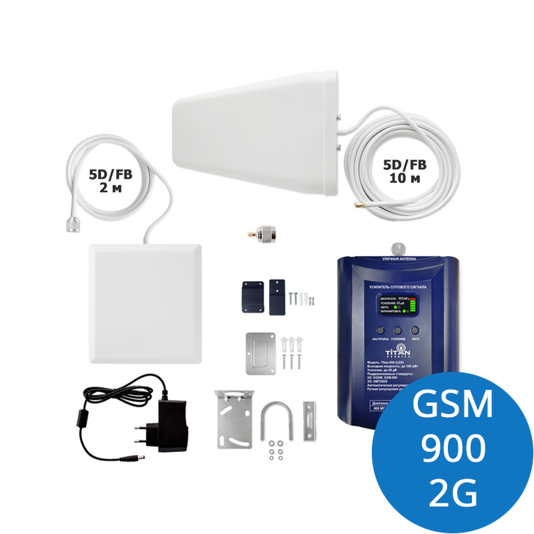 Комплект Titan-900 (LED) состоит из усилителя (репитера) Titan-900 (LED) и комплекта антенн MultiSet. Работает в стандартах связи EGSM/GSM-900 (2G), UMTS900 (3G).